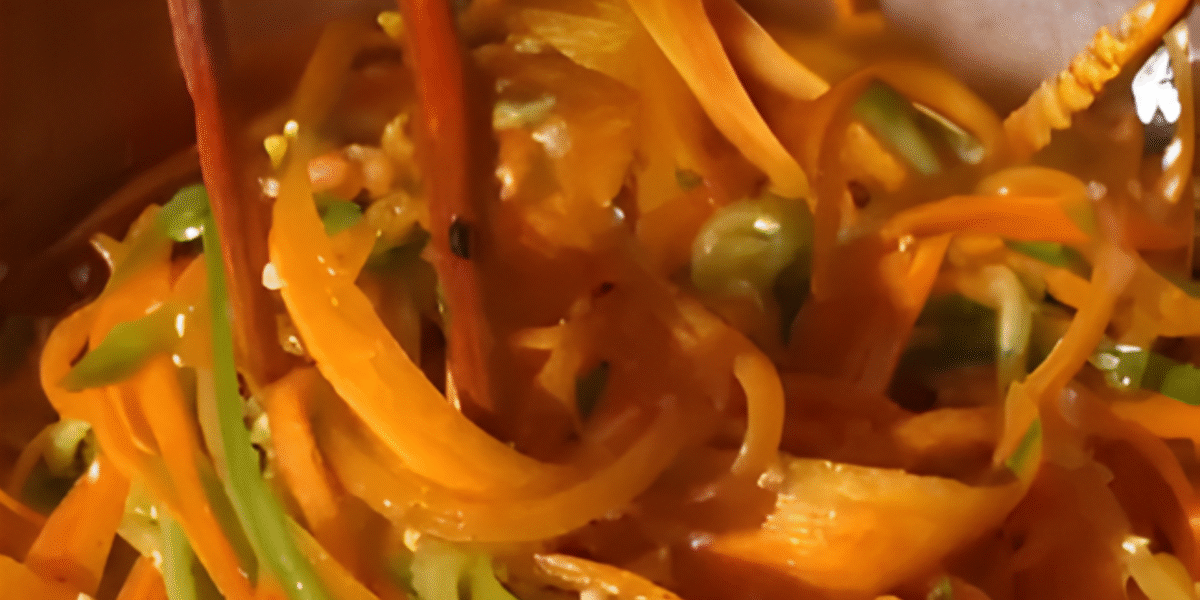 - Julienne or ribbon the cucumber and carrots into thin, even strips.
